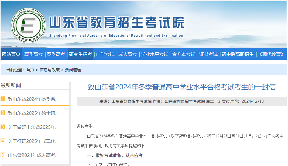 山東省教育招生考試院發布《致山東省2024年冬季普通高中學業水平合格考試考生的一封信》提醒各位考生,請考生在規定時間登錄報名系統自行打印準考證,打印時間為:12月20日—12月25日每天9:00—17:00,12月26日—12月31日每天7:00—20:00。