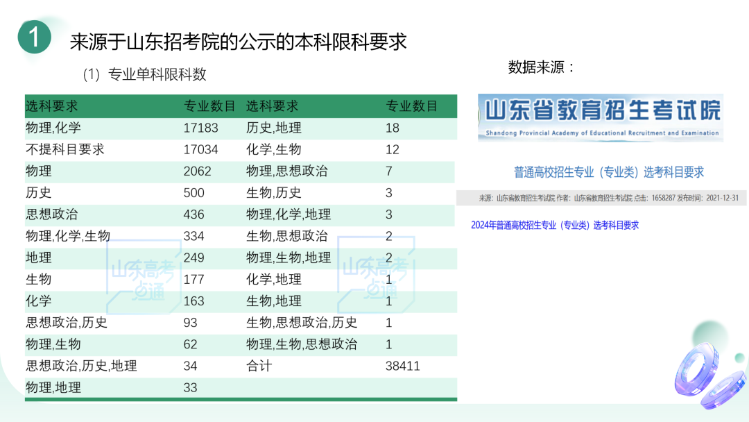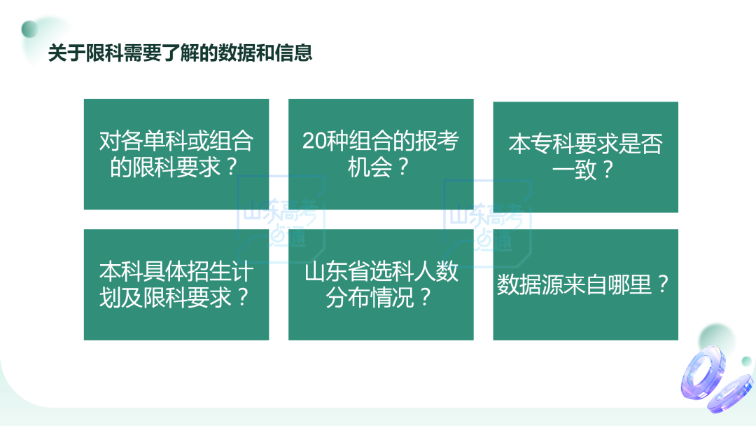 從圖中我們可以了解到,關于限科需要了解的數據和信息包含了六大方面,比如:相關大學和專業對各單科或組合有怎樣的限科要求,20種科目組合的報考機會是怎樣的,本科和專科學校及專業對限科的要求是否一致,本科具體的招生計劃以及限科要求是怎樣的情況,山東省選科人數的分布情況,另外就是很多數據都是經過數據源的分析,我們的家長要了解數據源來自哪里,我們要掌握到第一手資料,然后有針對性地去看一看,才能夠更加確信相關的內容。