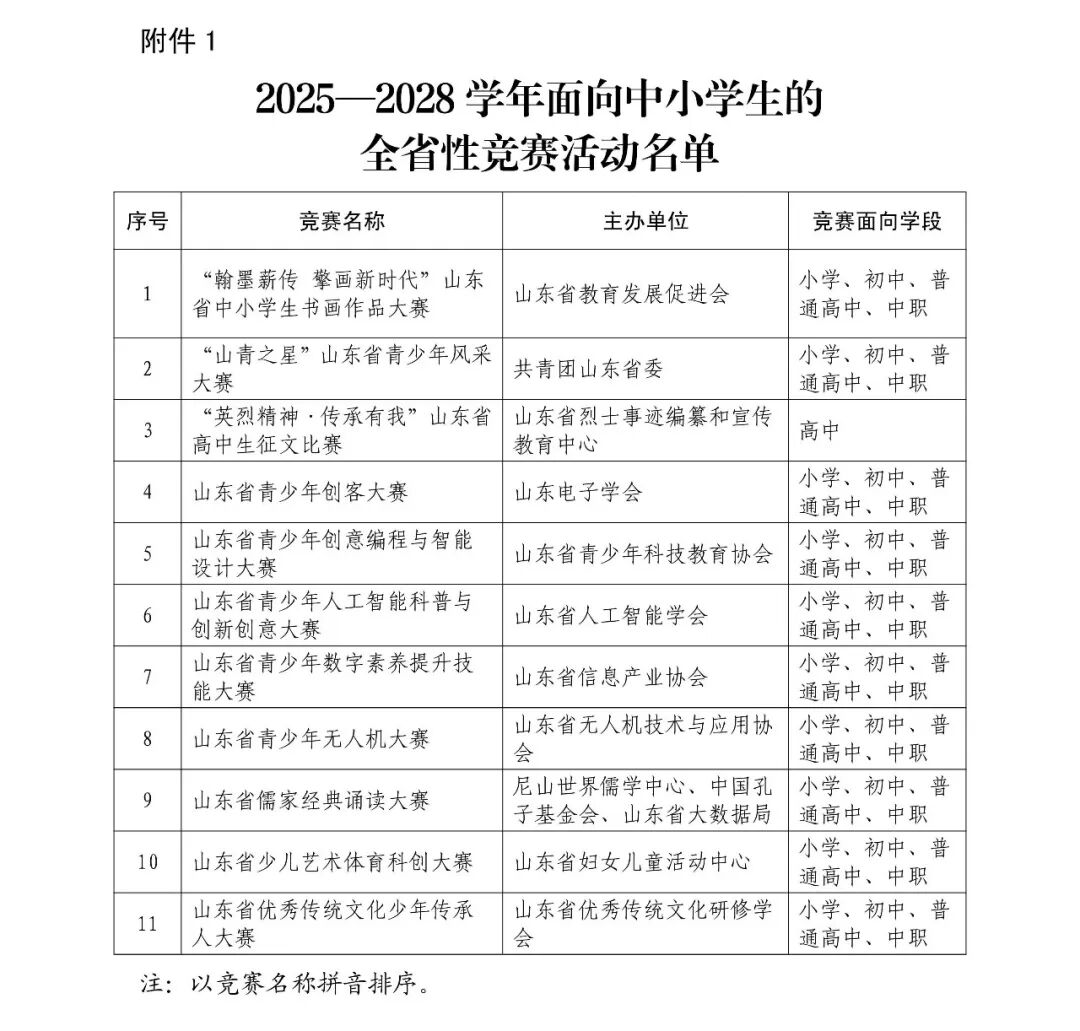 山東省教育廳關于公布2025—2028學年面向中小學生的全省性競賽活動和全國性競賽活動在我省備案名單的通知魯教監管字〔2026〕1號各市教育...